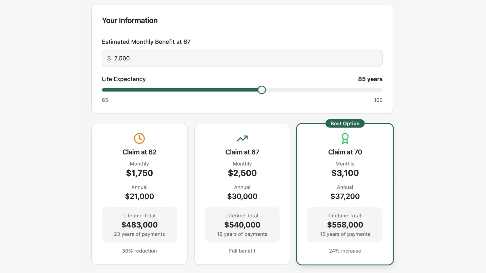 This analyzer models your lifetime benefits across different claim ages showing monthly payments, annual income, and total lifetime earnings. Input your estimated benefit at 67 and life expectancy to discover the optimal claiming age and see exactly how much more you could earn by waiting.