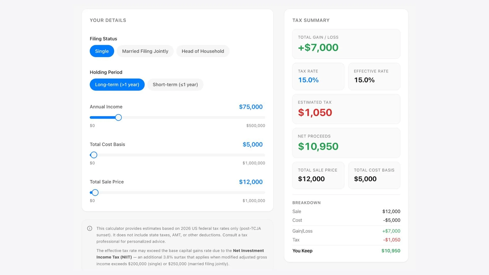 Calculate your capital gains tax liability instantly. Input your filing status, holding period, annual income, cost basis, and sale price to see your exact tax bill. This calculator reveals your tax rate, effective rate, and net proceeds—helping you understand the true cost of selling investments.