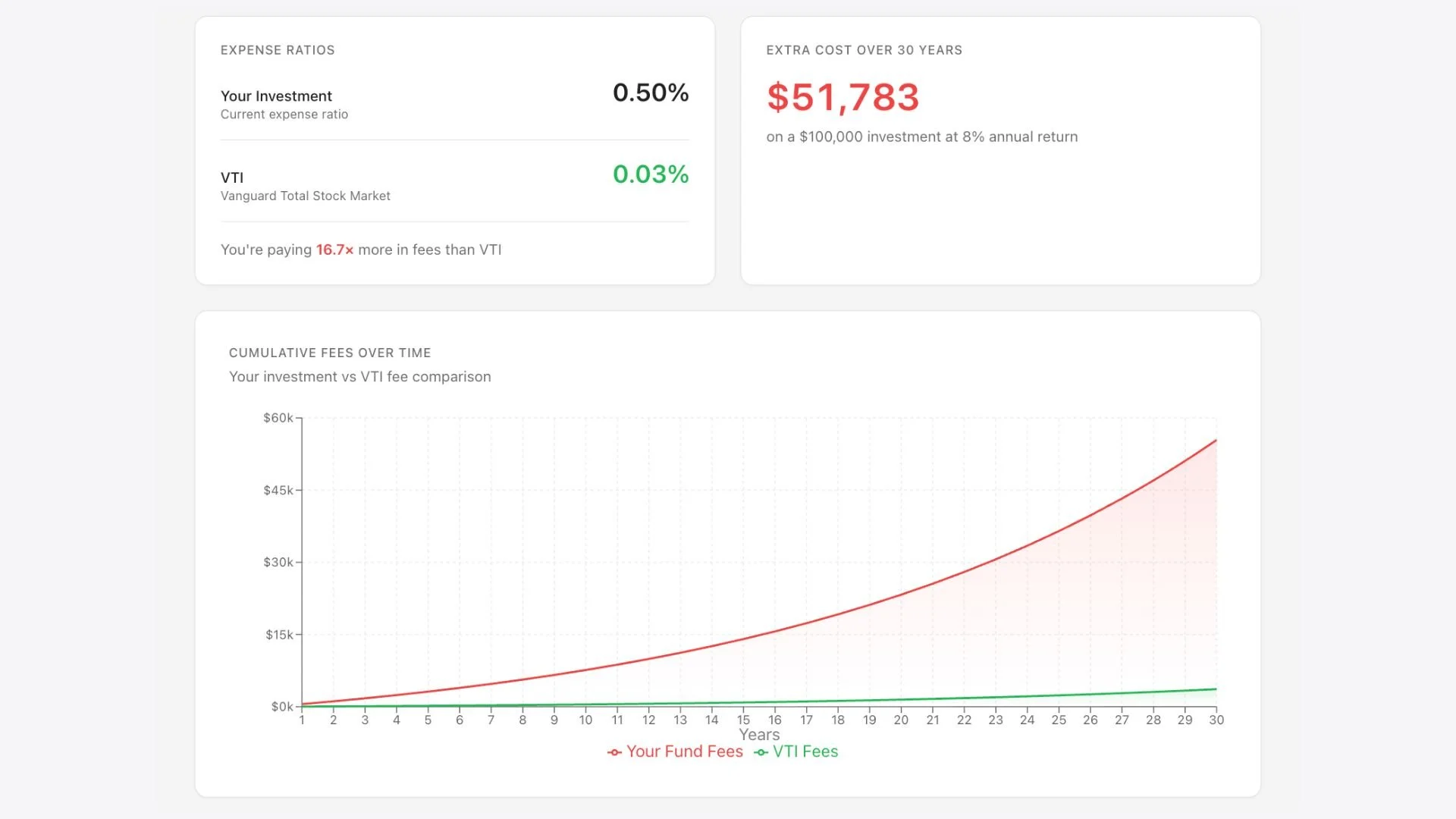 Discover how much you're actually paying in investment fees. This tool compares your advisor's expense ratio against low-cost alternatives, revealing the cost difference over time. Input your investment amount, current fees, and expected returns to see exactly how much extra you're paying.